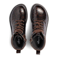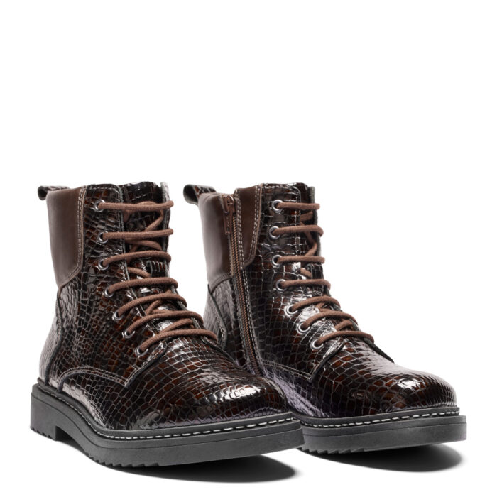 Flot høj damestøvle i brun skind med skinnende laklook og krokodilledetaljer.