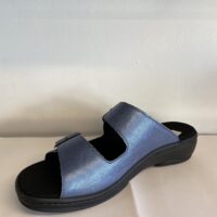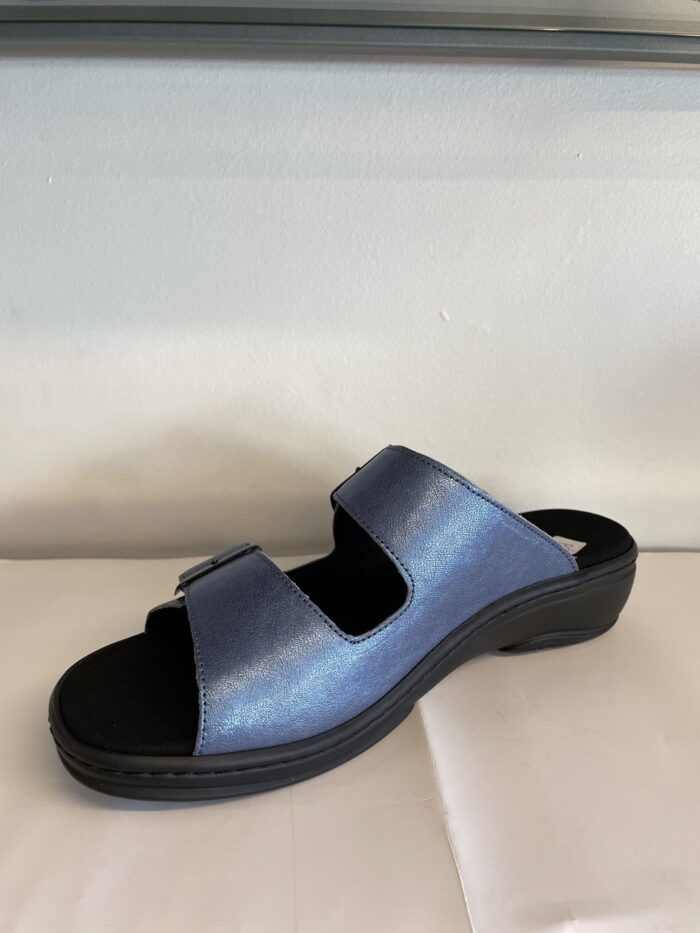 Slipperen er lavet i skind i en flot blå metallic farve.